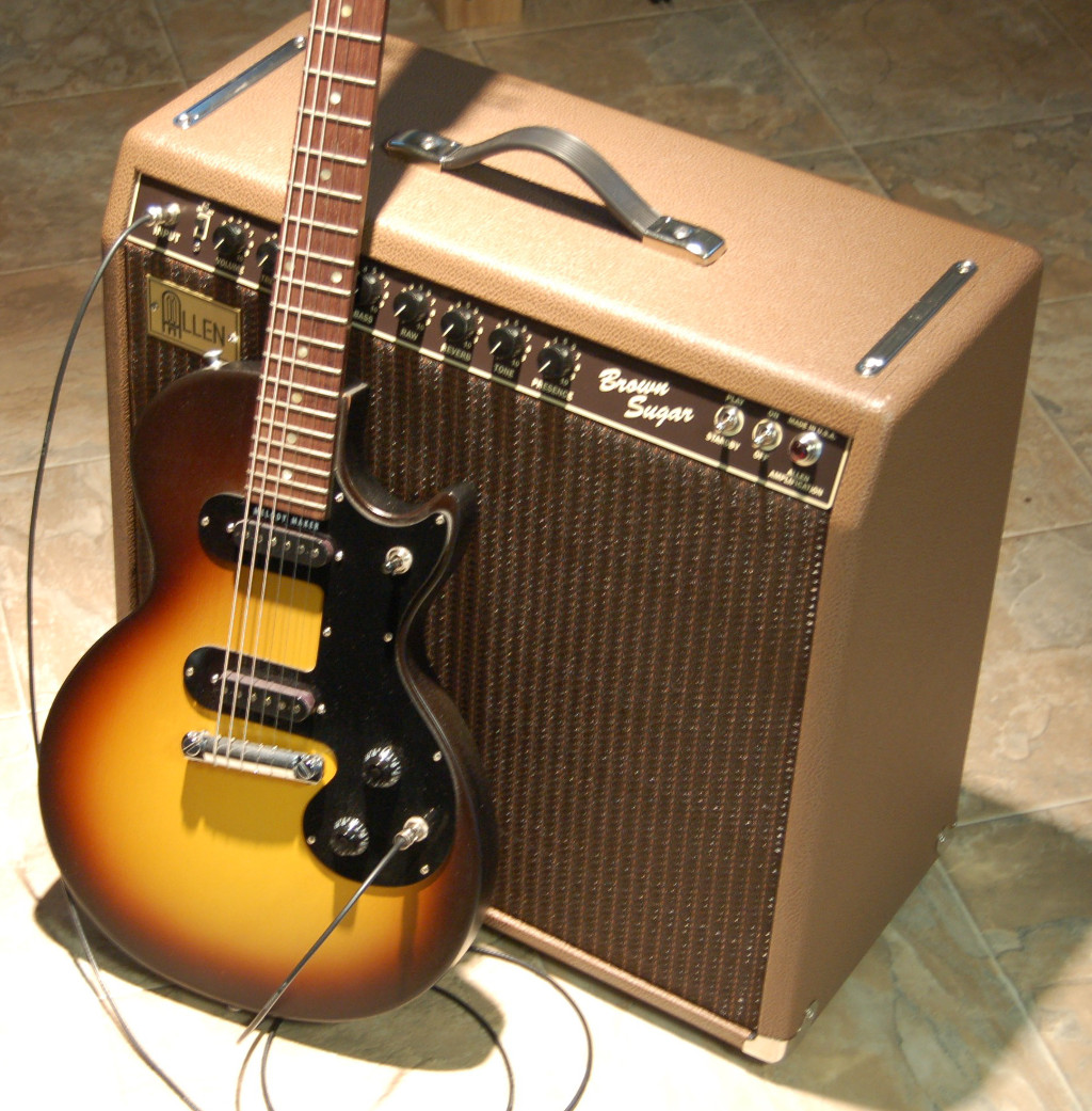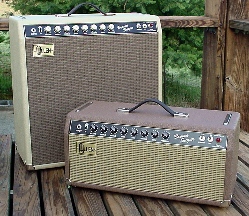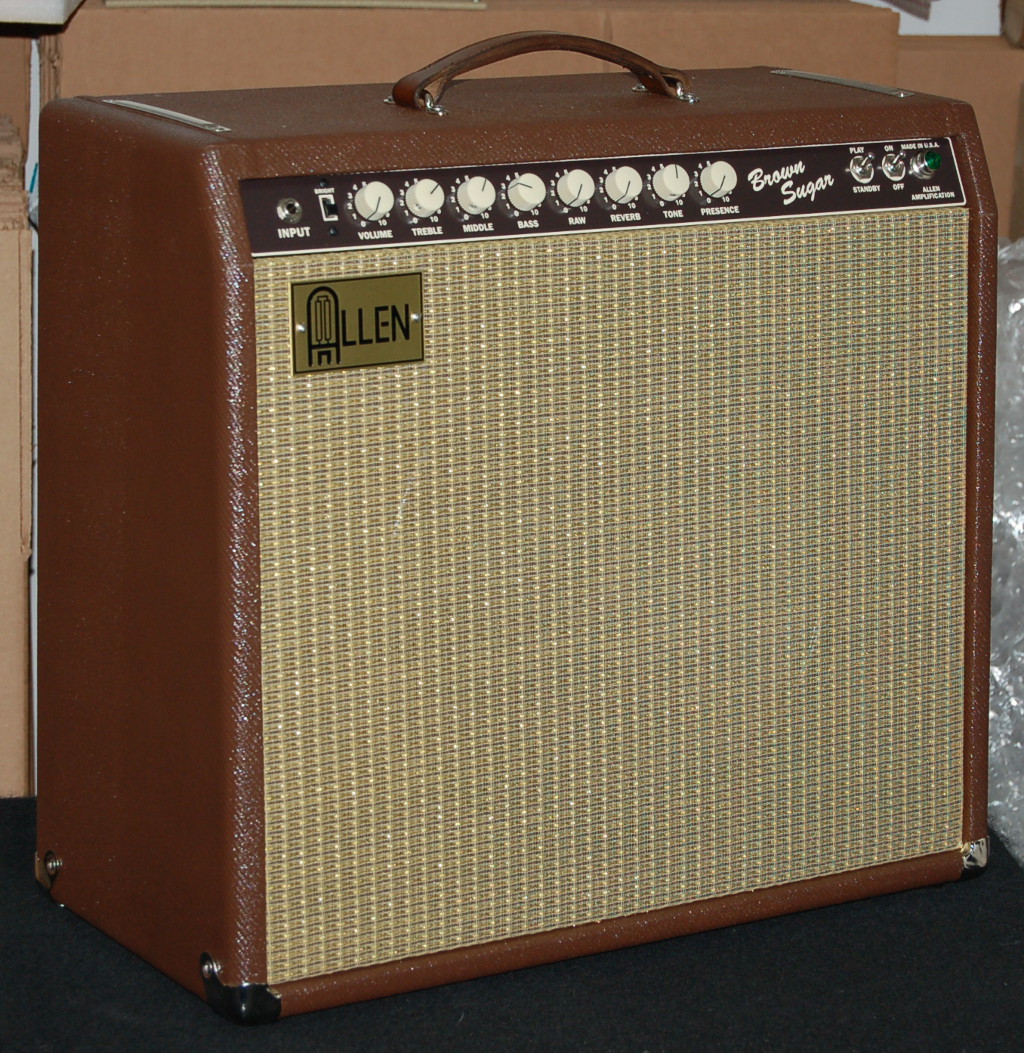 Finger-jointed pine with custom brown Tolex and grill cloths. Brushed brass logo, brown/ivory faceplate and black or cream barrel knobs. |